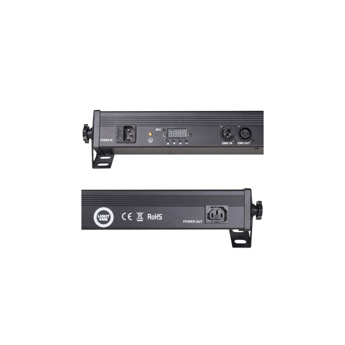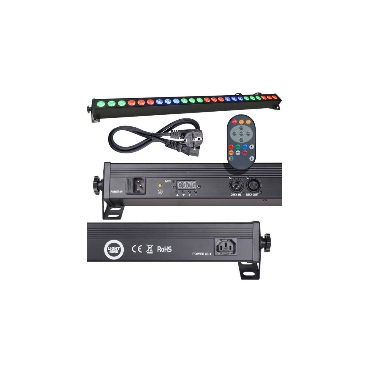 Listwa LED Light4Me Deco Bar wyposażona została w 24 mocne, 3-watowe diody (po 3 w 8 sekcjach), operujące światłem w palecie barw RGB. Na tylnym panelu znajdują się gniazda zasilania (w tym tzw. „podaj dalej” umożliwiające przekazywanie napięcia bezpośrednio z urządzenia do urządzenia), wejście i wyjście DMX oraz panel sterowania z cyfrowym wyświetlaczem i czterema przyciskami. Za ich pomocą możemy zmieniać ustawienia w menu, a także wybrać jeden z czterech interesujących nas trybów pracy: