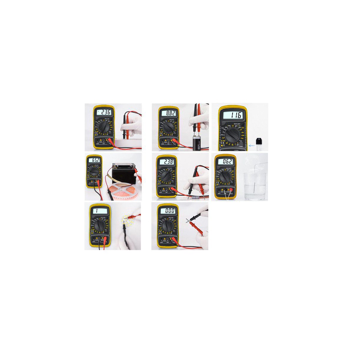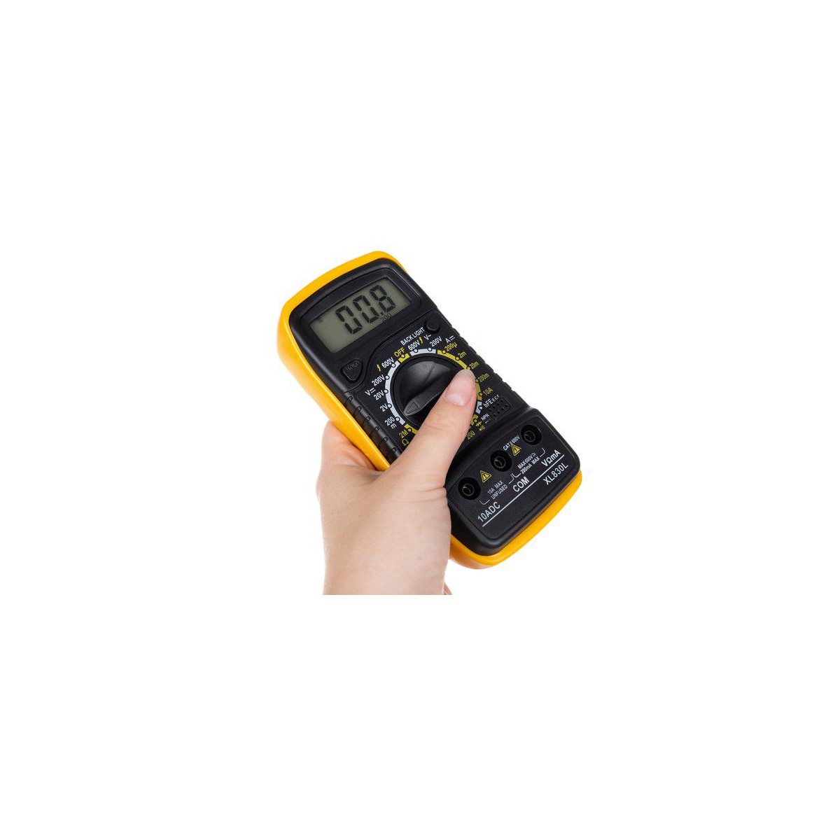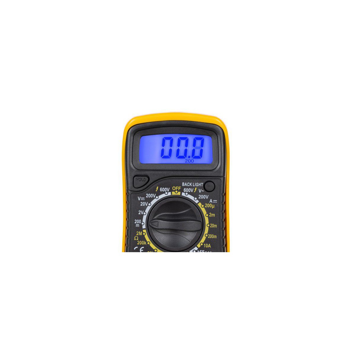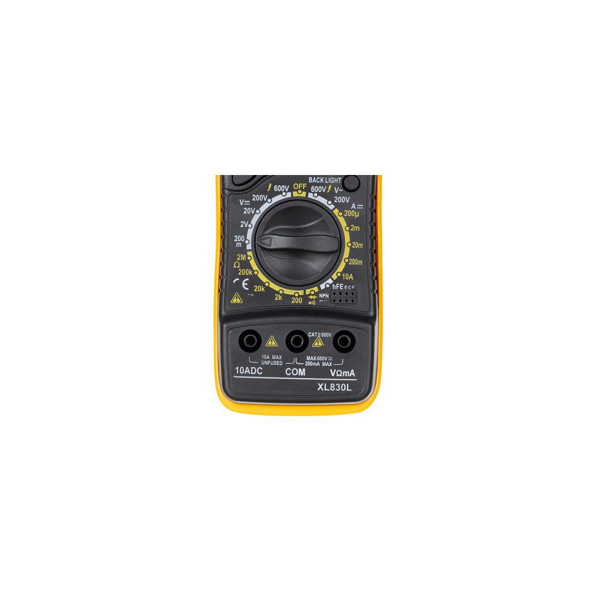 - SPECYFIKACJA - pomiar napięcia zmiennego AC w zakresie 0-750V; pomiar napięcia stałego DC w zakresie 0-1000V; pomiar natężenia prądu stałego DC w zakresie 0-10A; pomiar rezystancji w zakresie 0-2 Ohm; pomiar wzmocnienia tranzystorów hFE; test diod; wskaźnik niskiego poziomu baterii miernika; maksymalny odczyt 1999; sygnalizacja polaryzacji przy pomiarach prądu i napięcia stałego; sygnalizacja przekroczenia zakresu pomiarowego; zasilanie: bateryjne; wymiary: 14x7x3,5 cm; waga: 0,125 kg; waga w opakowaniu: 0,237 kg.