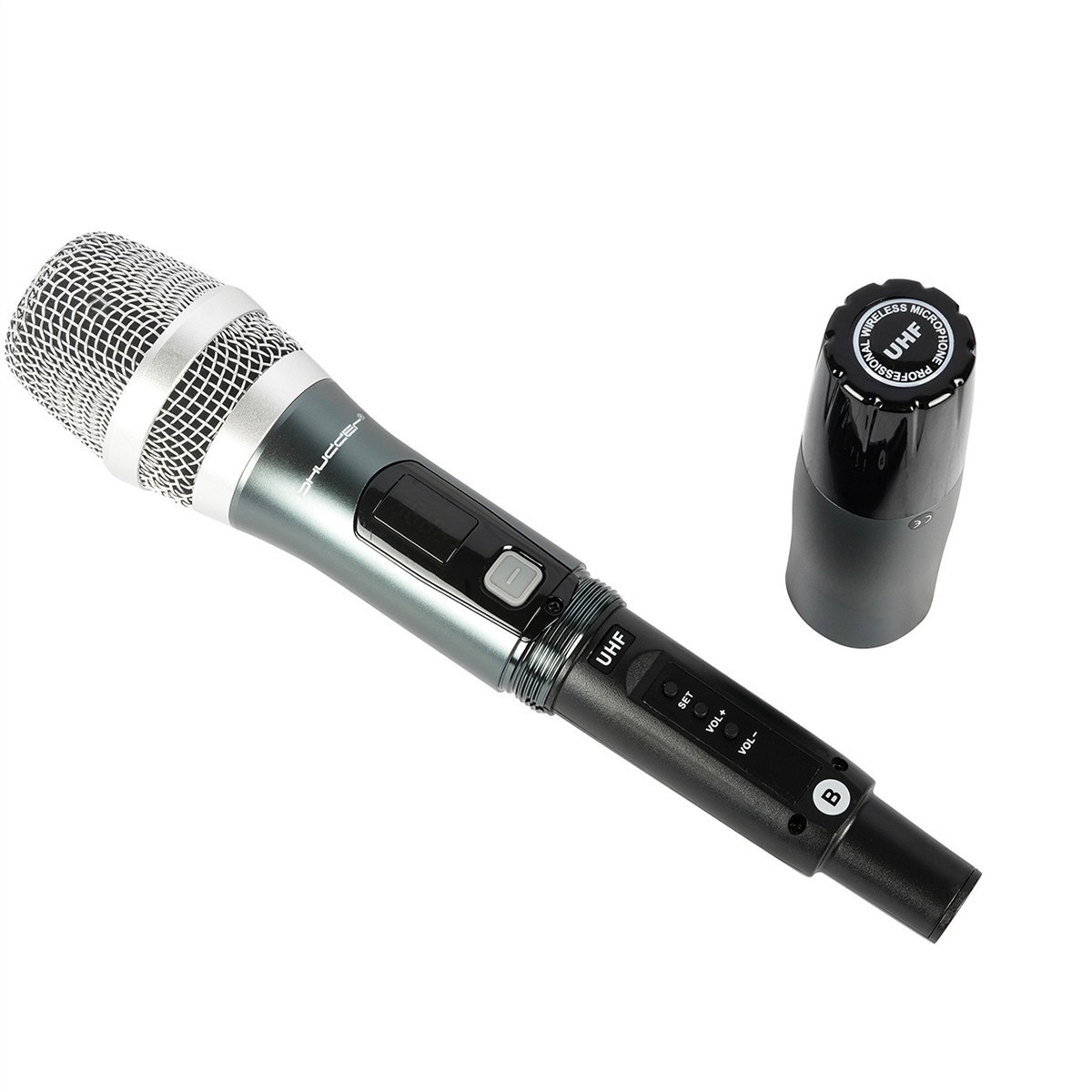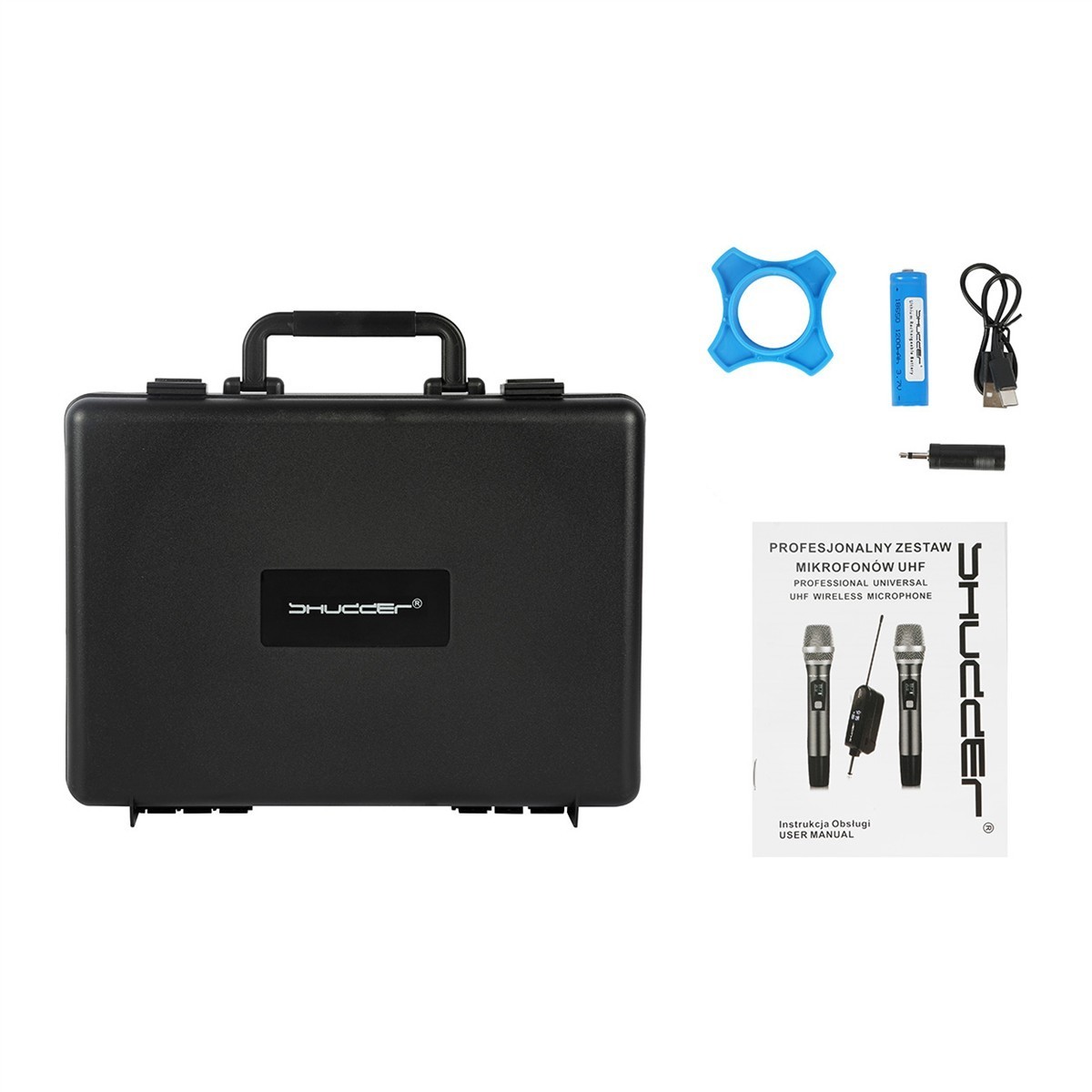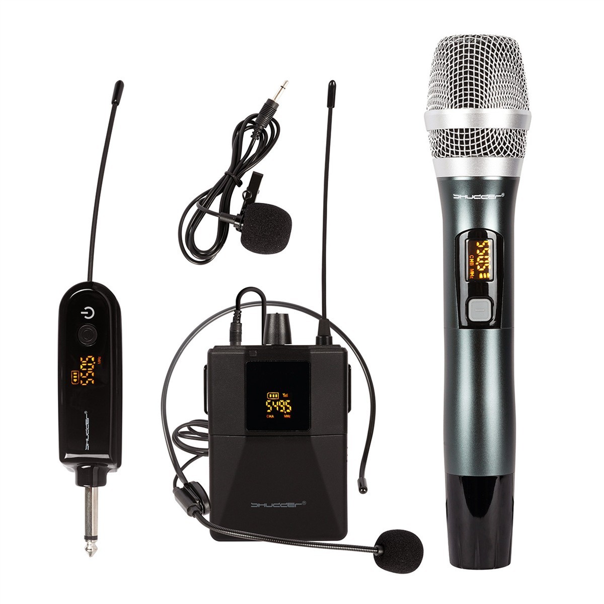 Mikrofony bezprzewodowe Shudder SDR703 zestaw mikrofon doręczny + zestaw nagłowny z klipsem krawatowym z zasilanie akumulatorowym odbiornika i zmiennymi kanałami