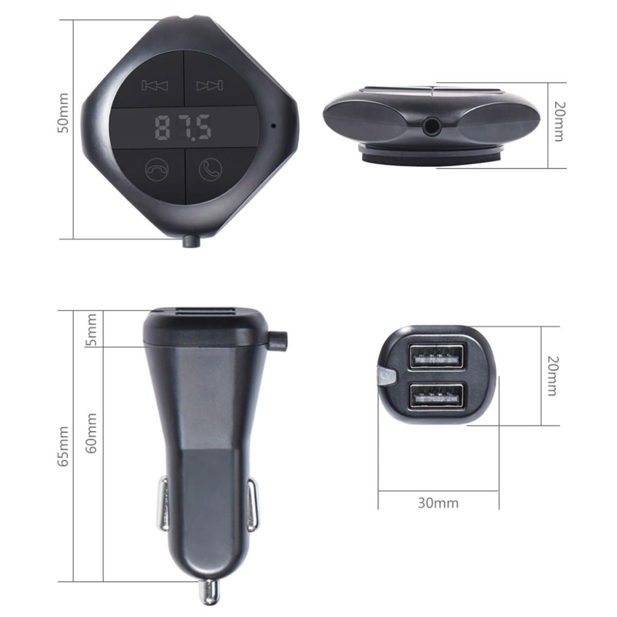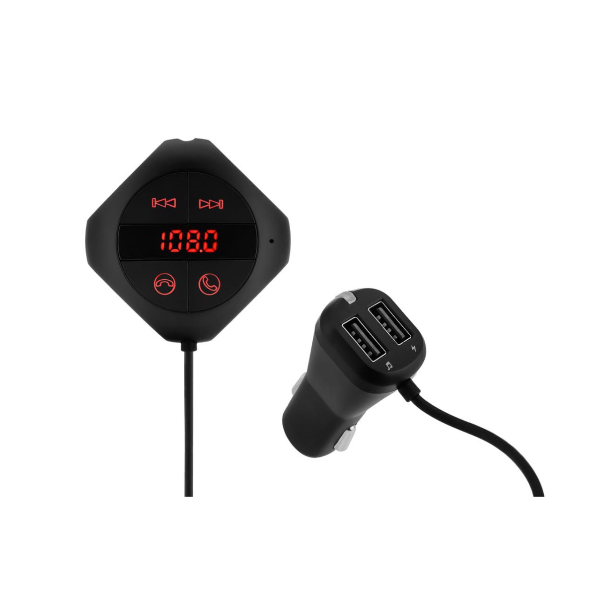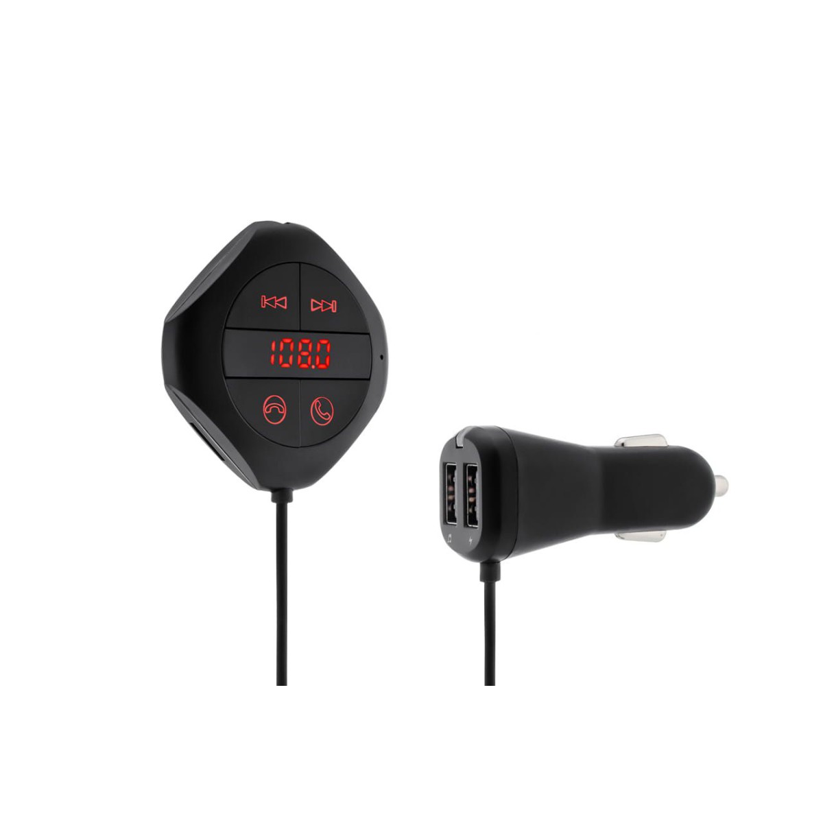Dwa gniazda USB umożliwiają jednoczesne ładowanie naszego smartphona oraz odtwarzanie muzyki poprzez transmiter.
