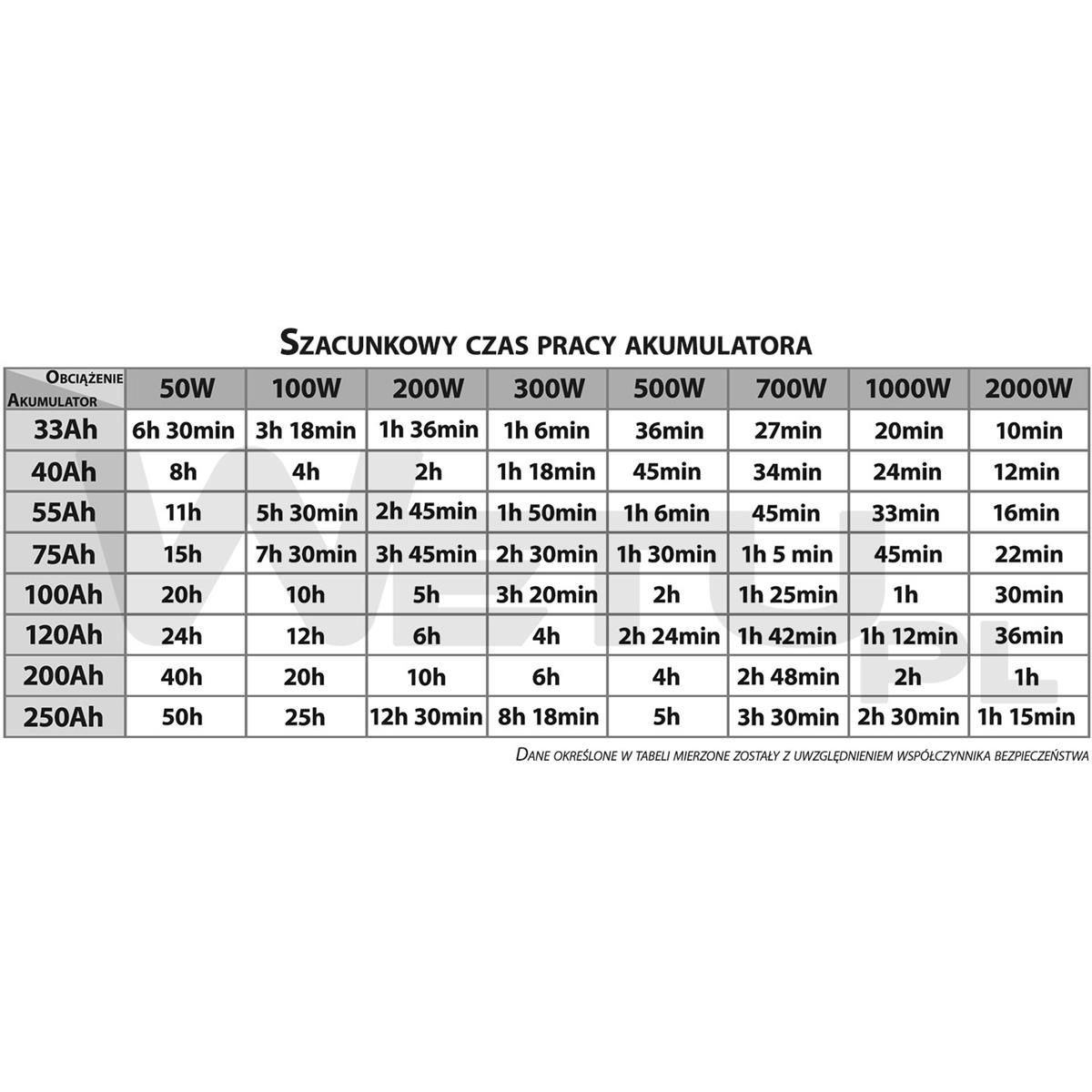 Zabezpieczenie: przeciwzwarciowe po stronie 230V, przeciążeniowe po stronie 230V, zabezpieczenie przed rozładowaniem akumulatora po stronie 12V