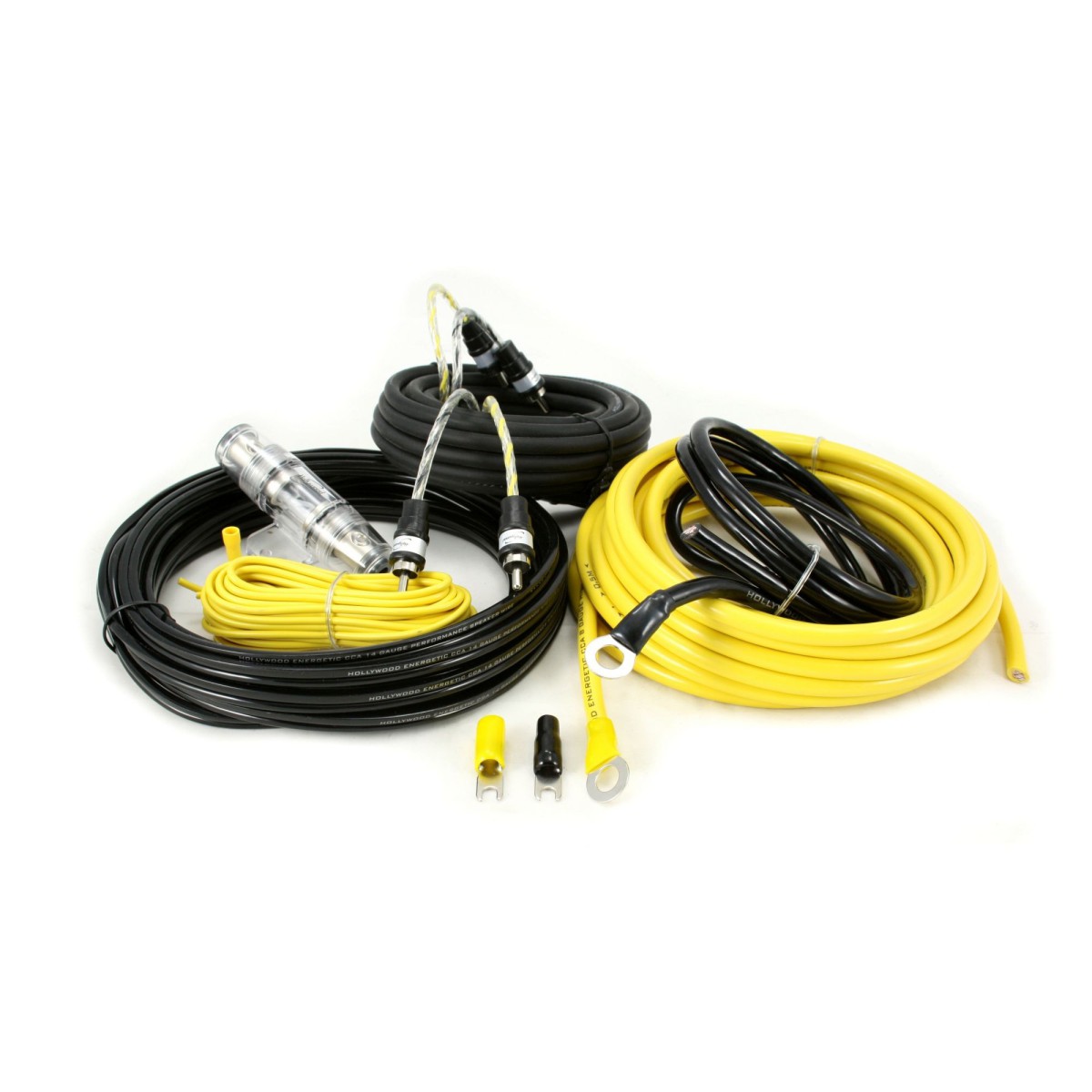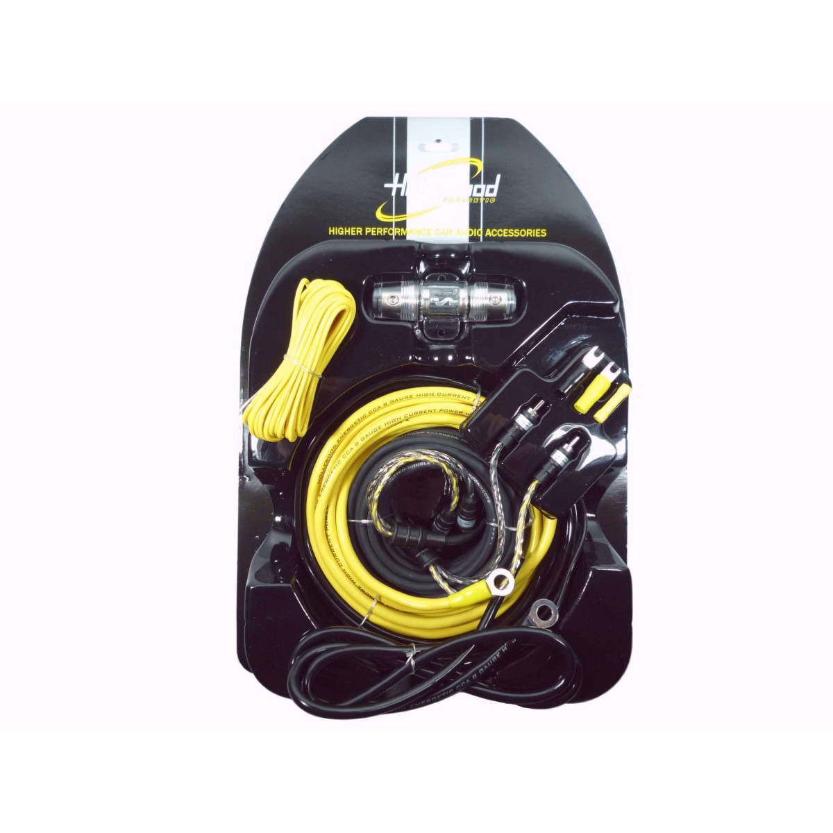 Hollywood CCA-28 zestaw kabli do samochodowego wzmacniacza 1/2-kanałowego - zasilanie 8GA (ok. 8,5 mm2), 50A/300W, kable głośnikowe 5m, 2xRCA, REM
