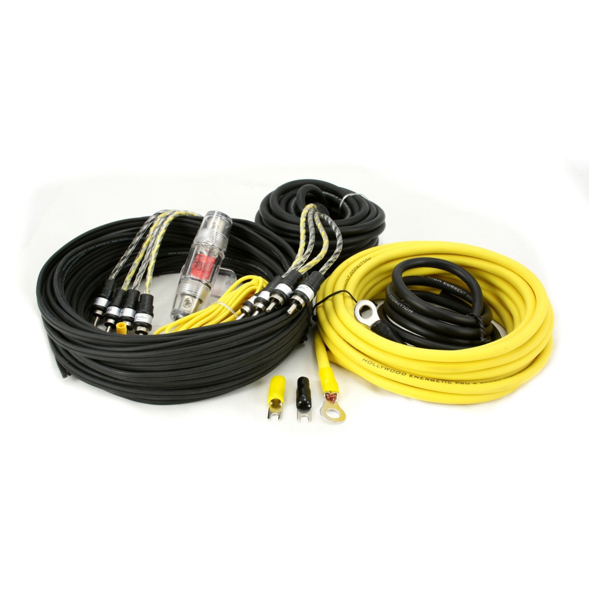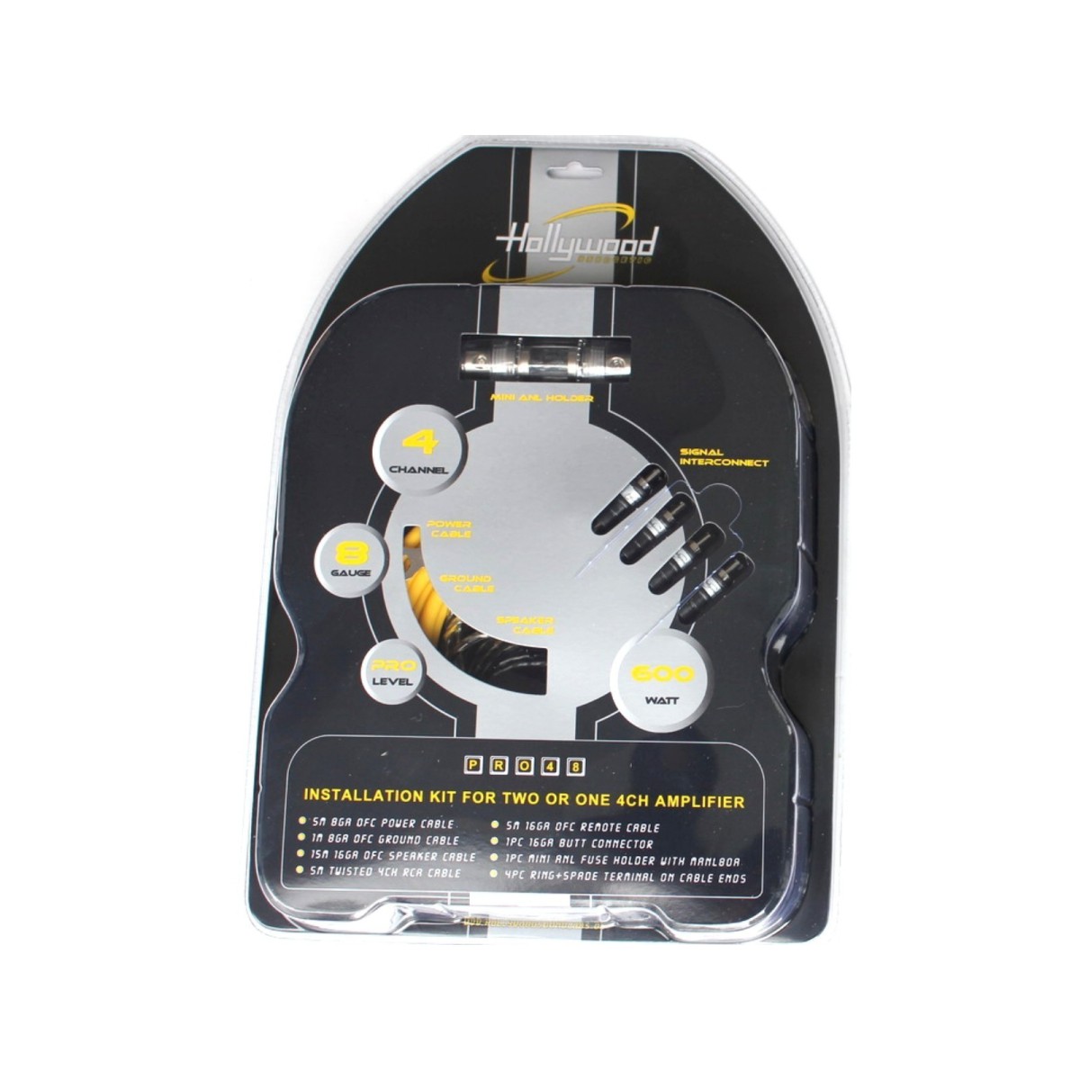 Hollywood PRO-48 - zestaw kabli OFC do samochodowego wzmacniacza 4-kanał. - zasilanie 8GA (ok. 8,5 mm2), 80A/600W, kable głośnikowe 15m, 4xRCA, REM