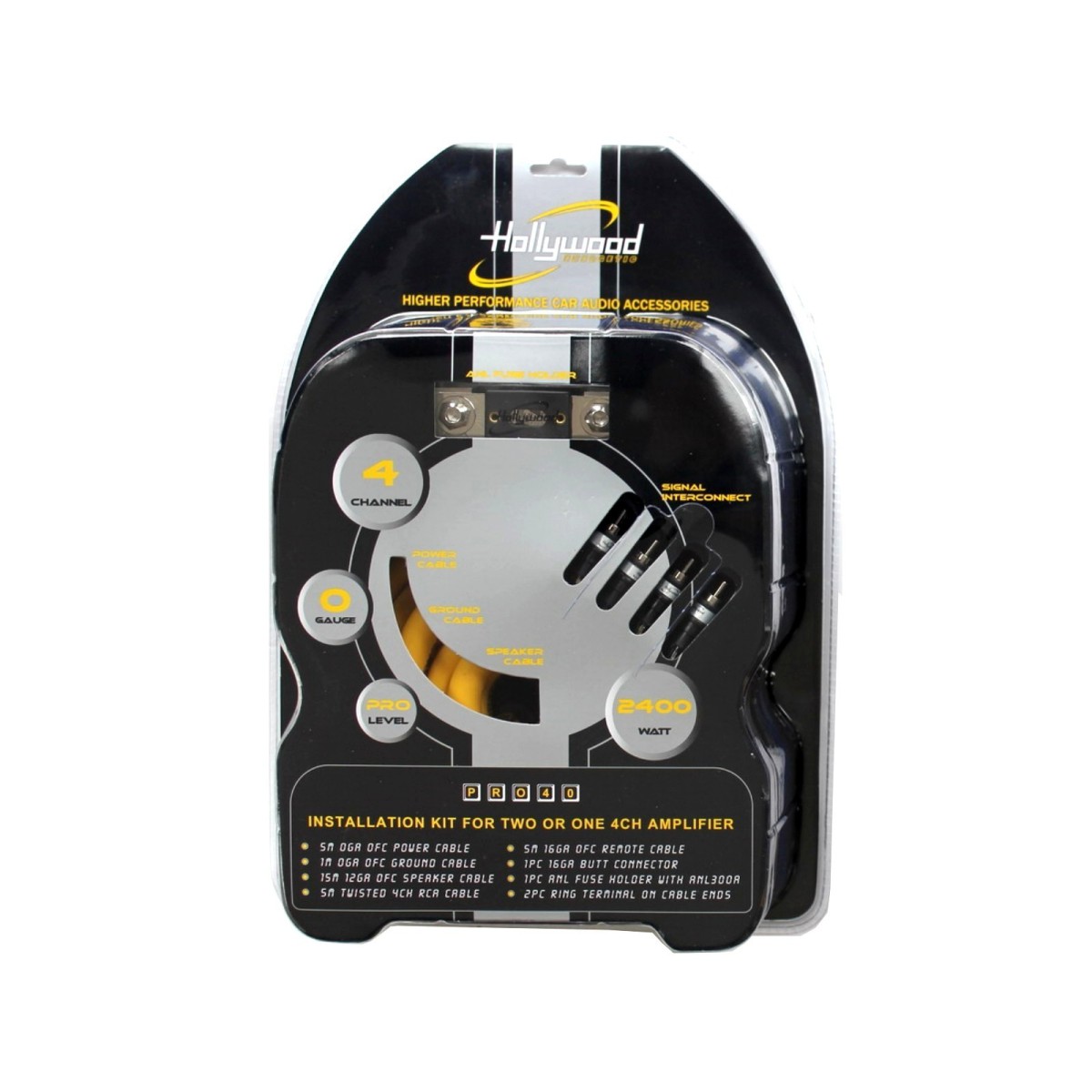 Hollywood PRO-40 - zestaw kabli OFC do samochodowego wzmacniacza 4-kanał. - zasilanie 0GA (ok. 53 mm2), 300A/2400W, kable głośnikowe 15m, 4xRCA, REM